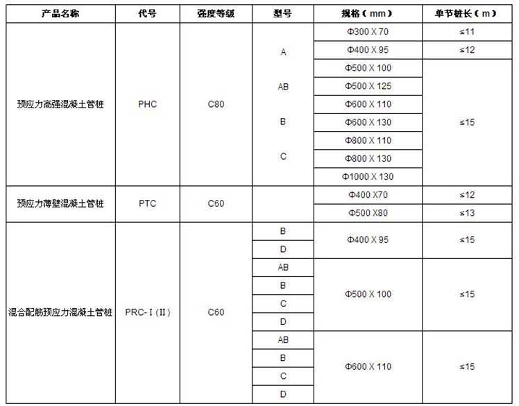 業(yè)臻管樁集團(tuán)生產(chǎn)各類預(yù)應(yīng)力混凝土管樁,直徑范圍300mm-1000mm,管樁壁厚度一般在70mm至130mm,長度主要在5m至15m之間。業(yè)臻管樁生產(chǎn)的預(yù)應(yīng)力混凝土管樁(PHC)、預(yù)應(yīng)力薄壁管樁(PTC)、以及混合配筋預(yù)應(yīng)力混凝土管樁(PRC-Ⅰ(Ⅱ)),可滿足客戶不同項目所在區(qū)域的環(huán)境與地質(zhì)狀況需求。